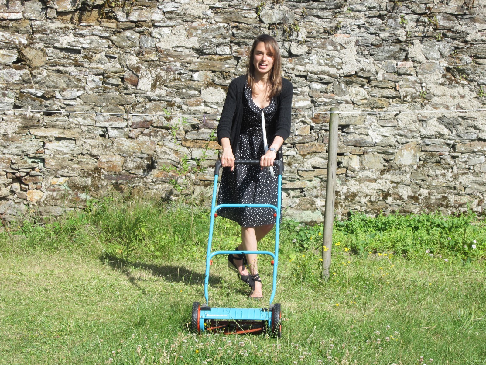 that we would cut the grass together! Usually, our 92 year old landlord takes pride in doing it for us, keeping his own yard and flower garden neatly trimmed. But, since he has been having some trouble getting around lately, Benoit and I took the liberty in doing him a small favor and cut the lawn ourselves. As my chocolate chip cookies were happily baking in the oven (not kidding), I see Benoit come out from the shed with a strange looking device: